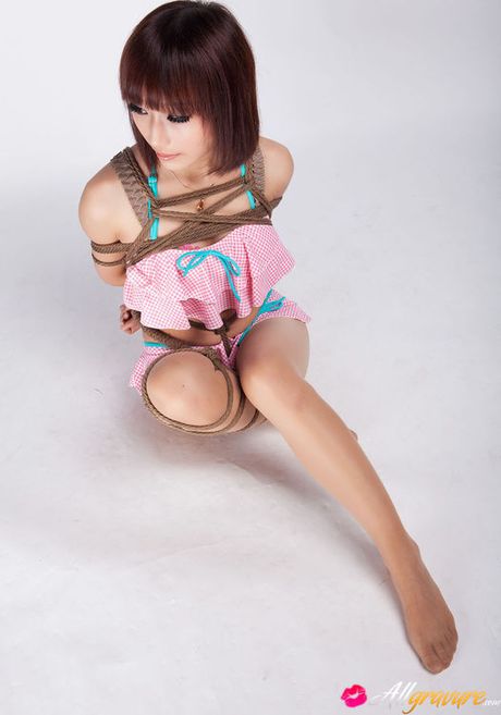 All Gravure: Ayako Asian leering babe has big smile on face as is tied in rope