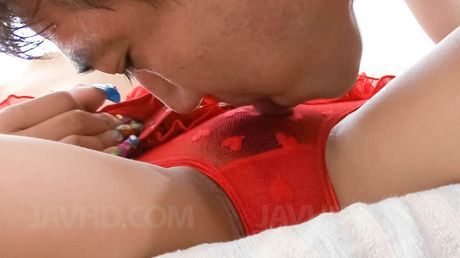 Ferame: Chihiro Kobayashi Asian has hot pussy licked over red lingerie