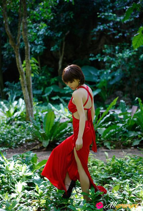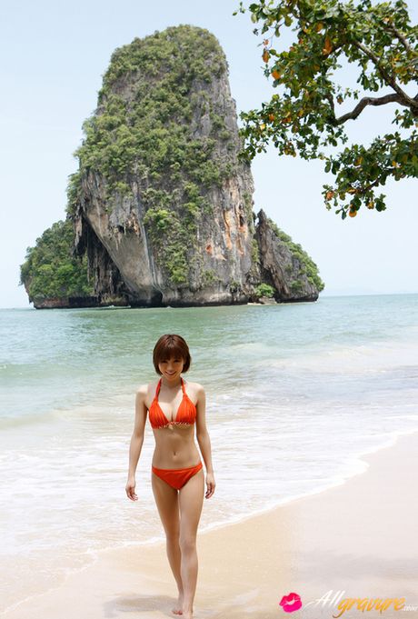 All Gravure: Yumiko Shaku Asian in orange bath suit takes a walk on the beach